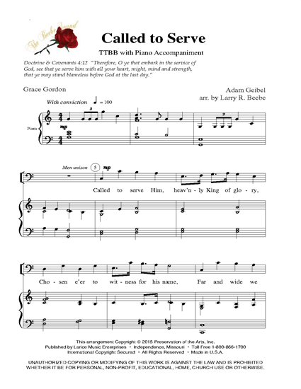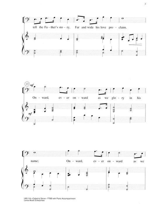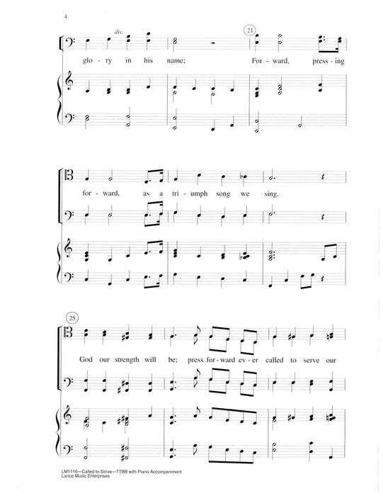 An energetic hymn of Christian discipleship that is particularly powerful in this new arrangement for TTBB men's voices. The introduction is reminiscent of a trumpet call and the piece begins in soft unison growing in intensity into two-part harmony, then four-part harmony. The last chorus builds to fortissimo and then the piece concludes with a repeat of the last two phrases that decrescendo to the end. The musical effect is of a marching army approaching and passing by, which is wonderfully suited to the text.