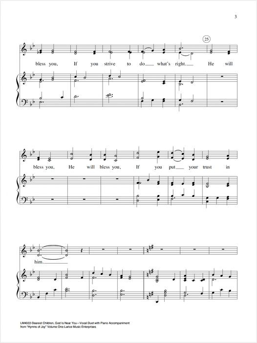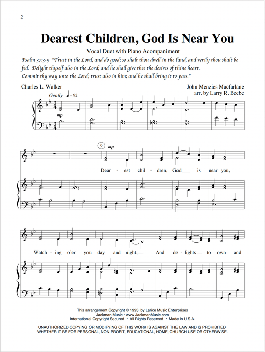 This arrangement is by Larry R. Beebe. Dearest Children God Is Near You, with text by Charles L. Walker and music by John Menzies Macfarlane.