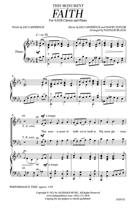 "This Monument of Faith" is a worshipful and energetic anthem, arranged for SATB chorus and piano accompaniment. Created by the composer Jay Lawrence, in collaboration with David Taylor, and arranged by Natalie Black, it is the perfect choice for dedications of temples and other sacred edifices.